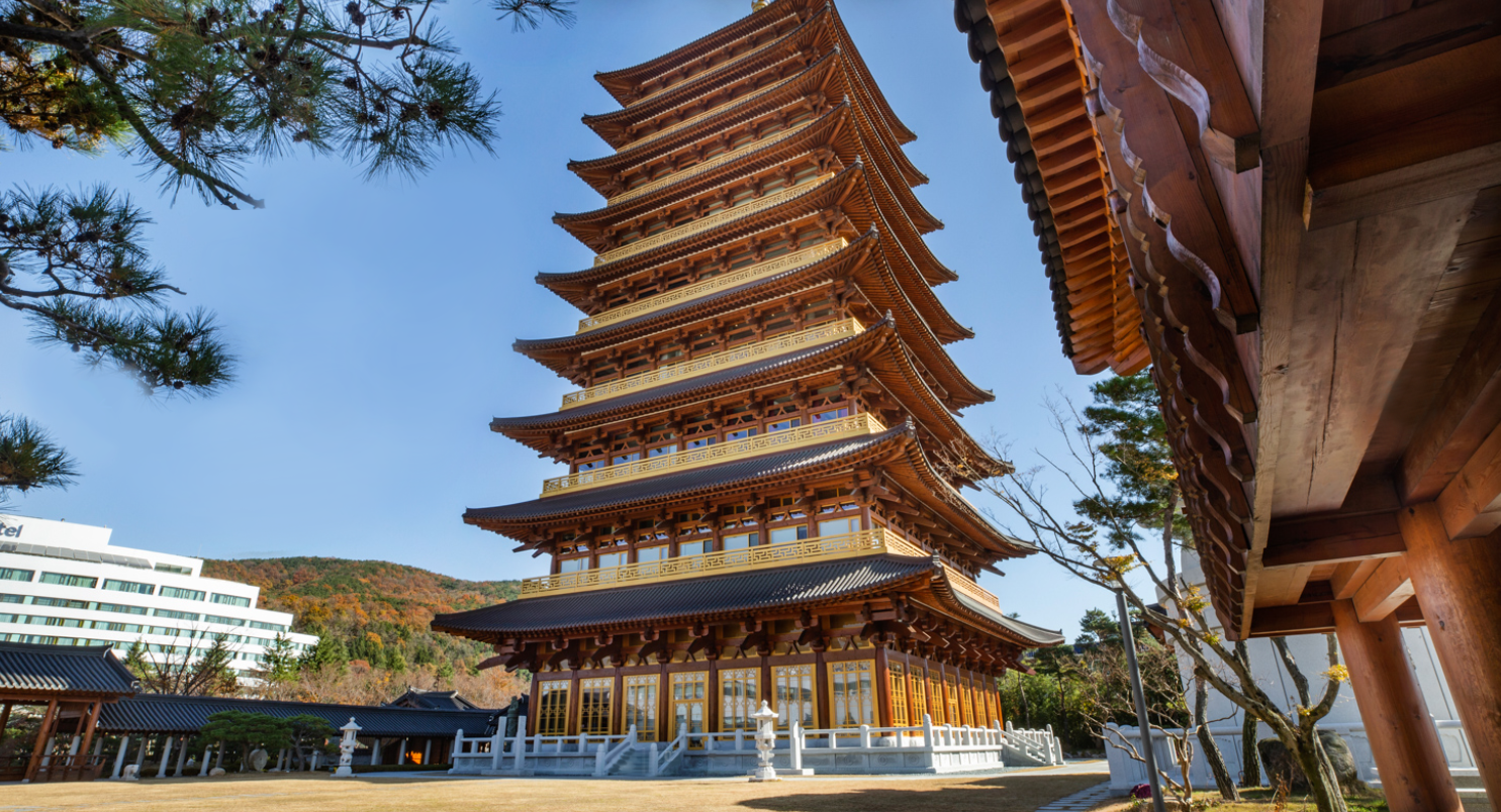 웅장한 외관은 신라의 황룡사지 9층 목탑 문화유산을 재현하여 완성되었으며, 내부는 연수와 휴식을 동시에 누릴 수 있도록 설계되었습니다.
