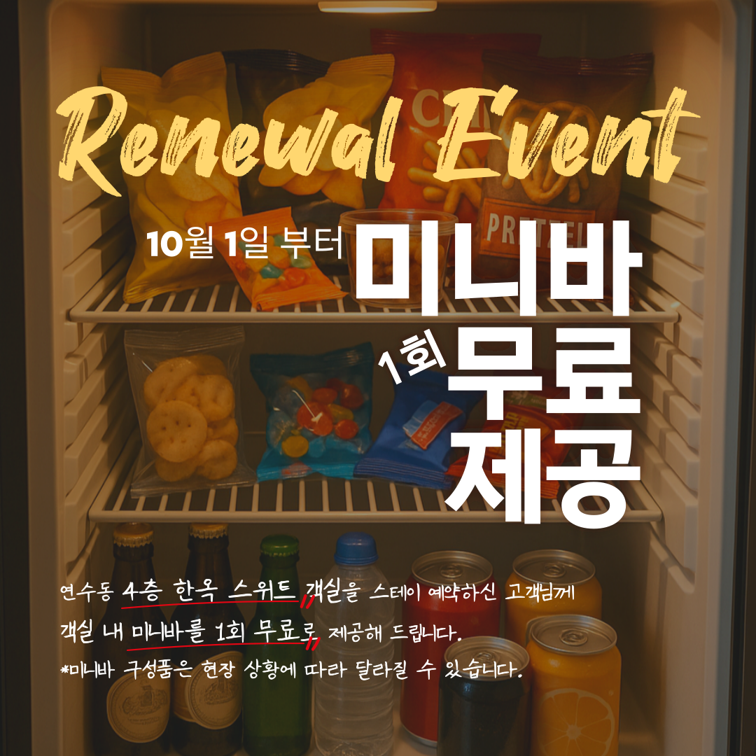 2025년 10월 1일부터 해당 객실을 스테이 예약하신 고객님께는객실 내 미니바를 1회 무료 제공해 드립니다.(*이벤트는 준비된 수량 소진 시까지 진행됩니다.)