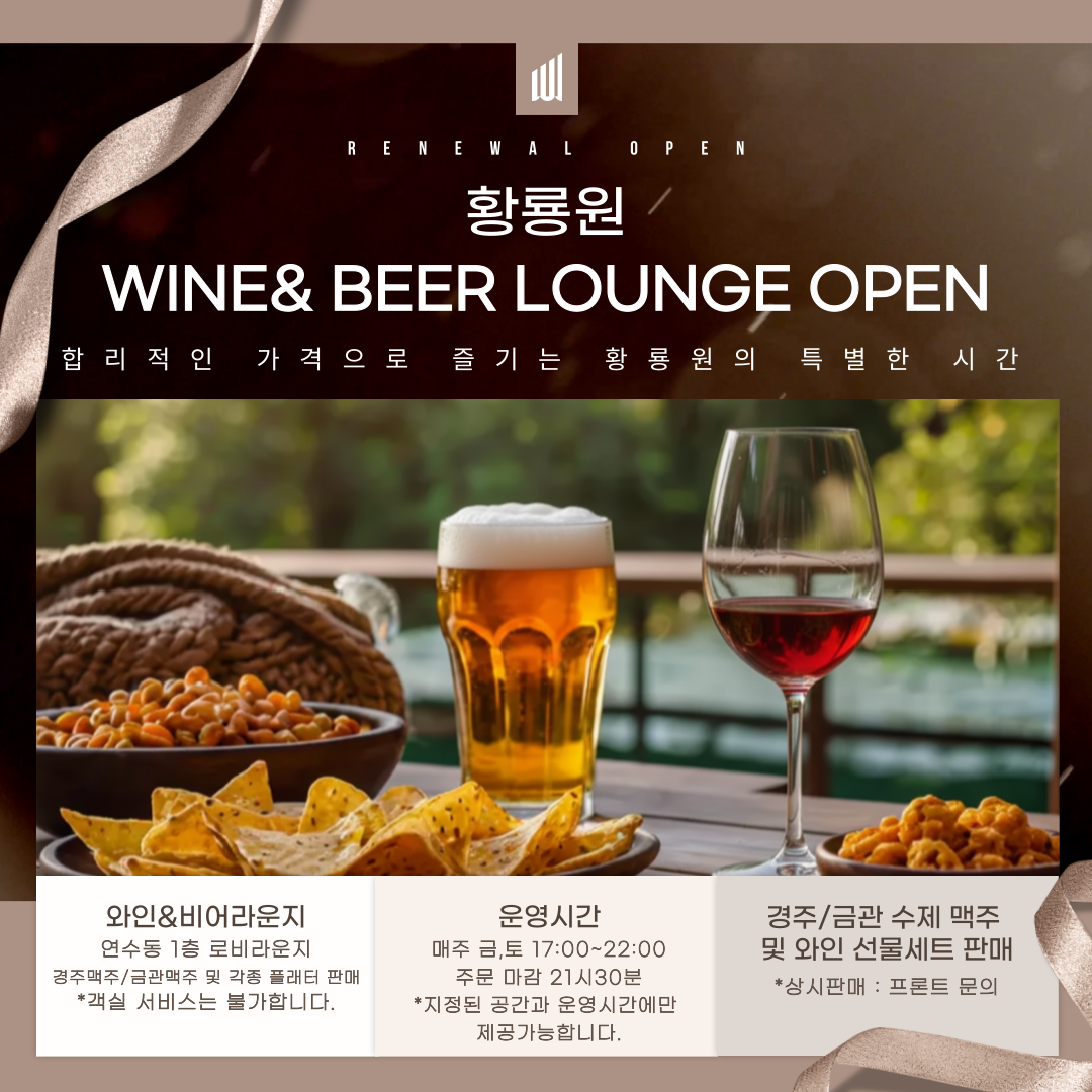 안녕하세요, 황룡원스테이입니다.황룡원 연수동 1층 로비라운지에서 Lounge in 황룡원이 새롭게 오픈하였습니다.맥주와 함께 즐길 수 있는 다양한 플래터 메뉴를 준비하였으니 많은 이용 바랍니다.